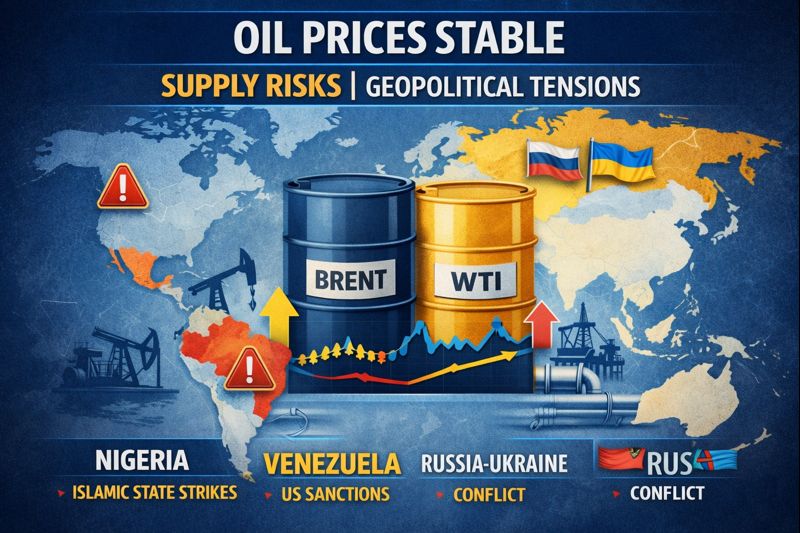 Oil prices remain range-bound as markets balance geopolitical risks, rising global supply, and low holiday trading activity. While global tensions continue to shape sentiment, analysts say production levels and sanctions policy will play a larger role in determining oil prices in the months ahead.